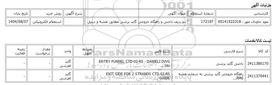 | محمد جاودان مهر - 05141522318 | 172197 | دو ردیف ناخنی و راهگاه خروجی گاید برشی مطابق نقشه و دیتیل | استعلام الکترونیکی | 1404/08/07 |