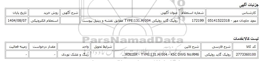 | محمد جاودان مهر - 05141522318 | 172199 | رولیک گاید رولیکی TYPE:131.H/004 مطابق نقشه و دیتیل پیوست | استعلام الکترونیکی | 1404/08/07 |