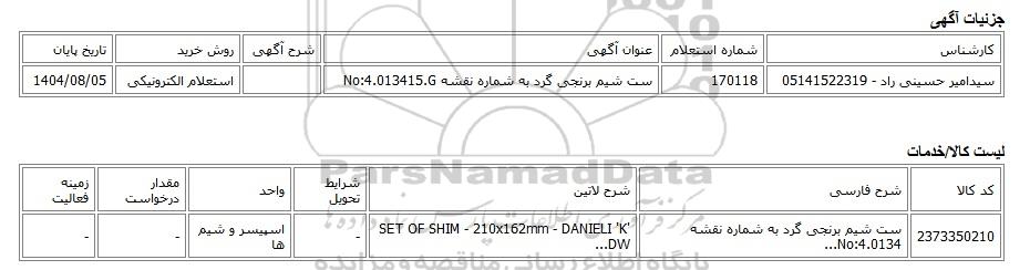 | سیدامیر حسینی راد - 05141522319 | 170118 | ست شیم برنجی گرد به شماره نقشه No:4.013415.G | استعلام الکترونیکی | 1404/08/05 |