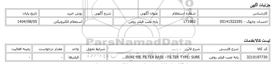 | احسان چابوک - 05141522291 | 171062 | پایه نصب فیلتر روغن | استعلام الکترونیکی | 1404/08/05 |