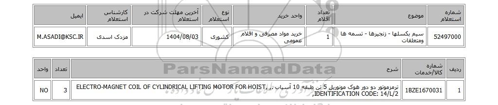 52497000سیم بکسلها - زنجیرها - تسمه ها ومتعلقات1خرید مواد مصرفی و اقلام عمومیکشوری1404/08/03مزدک اسدیM.ASADI@KSC.IR