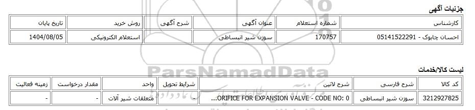 | احسان چابوک - 05141522291 | 170757 | سوزن شیر انبساطی | استعلام الکترونیکی | 1404/08/05 |