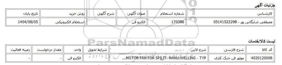 | مصطفی شایگانی پور - 05141522298 | 170386 | الکترو فن | استعلام الکترونیکی | 1404/08/05 |