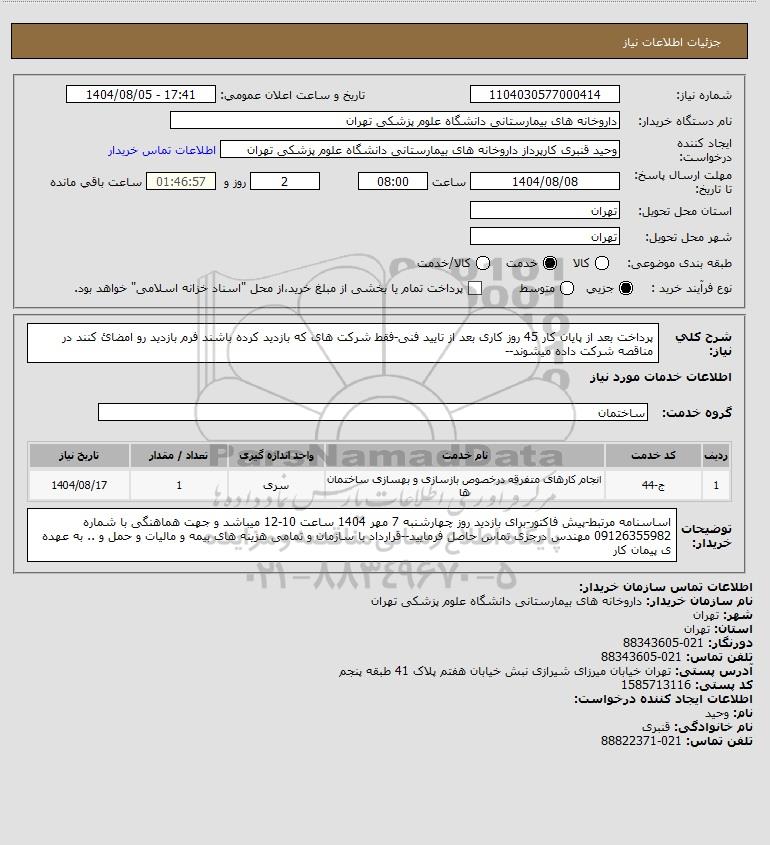 شرح کلی نیاز: پرداخت بعد از پایان کار 45 روز کاری بعد از تایید فنی-فقط شرکت های که بازدید کرده باشند فرم بازدید رو امضائ کنند در مناقصه شرکت داده میشوند--