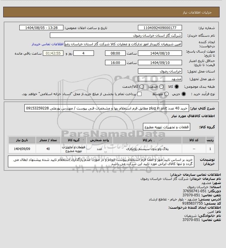 شرح کلی نیاز: خرید 40 عدد plug in unit مطابق فرم استعلام بها و مشخصات فنی پیوست / مهندس پورعلی 09153259228