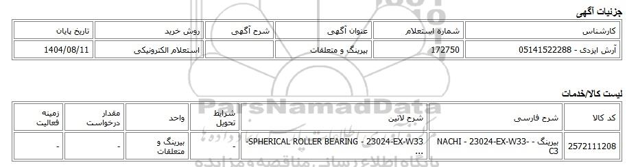 آرش ایزدی - 05141522288172750بیرینگ و متعلقاتاستعلام الکترونیکی1404/08/11