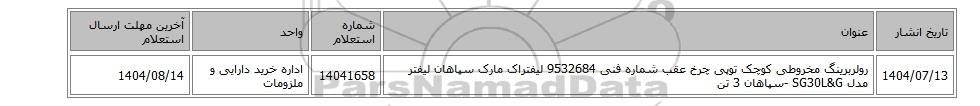 1404/07/13رولربرینگ ‎مخروطی‏ ‎کوچک توپی چرخ عقب‏ شماره فنی ‎9532684 لیفتراک مارک سپاهان لیفتر مدل SG30L&G -سپاهان 3 تن14041658اداره خرید دارایی و ملزومات1404/08/14