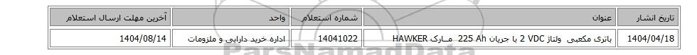 استعلام باتری مکعبی ‏ ولتاژ ‎2 VDC‏ با جریان ‎ 225 Ah مــارک HAWKER, استعلام، باتری مکعبی ‏ ولتاژ ‎2 VDC‏ با جریان ‎ 225 Ah مــارک HAWKER