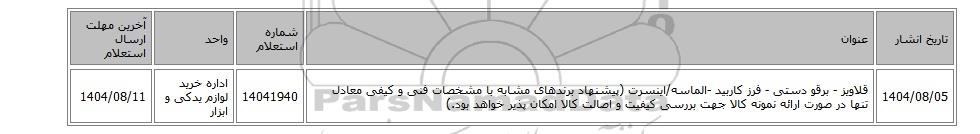 | 1404/08/05 | قلاویز - برقو دستی - فرز کاربید -الماسه/اینسرت (پیشنهاد برندهای مشابه با مشخصات فنی و کیفی معادل تنها در صورت ارائه نمونه کالا جهت بررسی کیفیت و اصالت کالا امکان پذیر خواهد بود.) | 14041940 | اداره خرید لوازم یدکی و ابزار | 1404/08/11 |