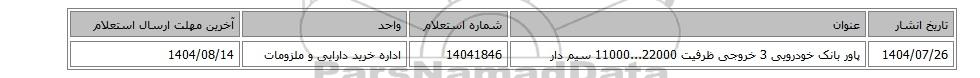 1404/07/26پاور بانک ‎خودرویی‏ ‎3 خروجی‏ ظرفیت ‎11000...22000‏ ‎سیم دار‏14041846اداره خرید دارایی و ملزومات1404/08/14