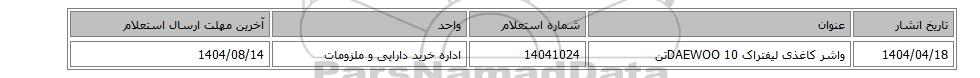 | 1404/04/18 | واشر کاغذی لیفتراک DAEWOO 10تن | 14041024 | اداره خرید دارایی و ملزومات | 1404/08/14 |