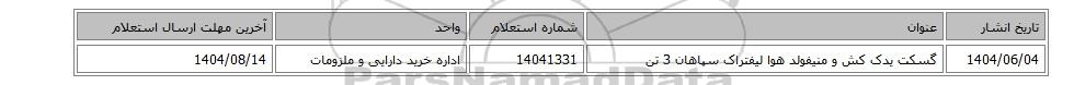 | 1404/06/04 | گسکت یدک کش و منیفولد هوا لیفتراک سپاهان 3 تن | 14041331 | اداره خرید دارایی و ملزومات | 1404/08/14 |