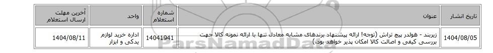 1404/08/05زیربند - هولدر پیچ تراش (توجه! ارائه پیشنهاد برندهای مشابه معادل تنها با ارائه نمونه کالا جهت بررسی کیفی و اصالت کالا امکان پذیر خواهد بود.)14041941اداره خرید لوازم یدکی و ابزار1404/08/11