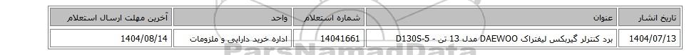 | 1404/07/13 | برد کنترلر گیربکس لیفتراک DAEWOO مدل 13 تن - D130S-5 | 14041661 | اداره خرید دارایی و ملزومات | 1404/08/14 |