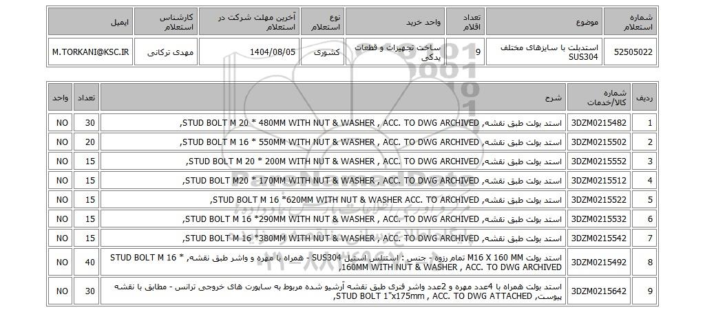 | 52505022 | استدبلت با سایزهای مختلف SUS304 | 9 | ساخت تجهیزات و قطعات یدکی | کشوری | 1404/08/05 | مهدی ترکانی | M.TORKANI@KSC.IR |