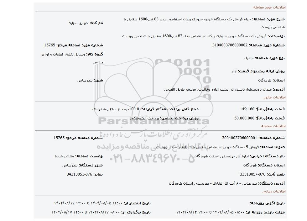 | عنوان معامله: فروش 5 دستگاه خودرو اسقاطی مطابق با شرایط و اسناد پیوست | ||