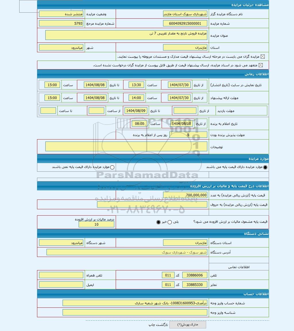 قیمت پایه (ارزش ریالی مزایده) به عدد700,000,000