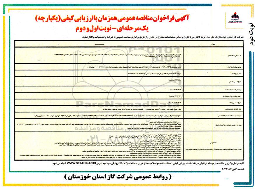 شرکت گاز استان خوزستان در نظر دارد خرید کالای مورد نظر را بر اساس مشخصات مندرج در جدول و از طریق برگزاری مناقصه عمومی به شرکت واجد شرایط واگذار نماید.