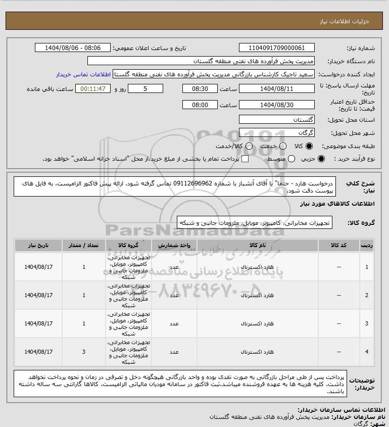 | 3 | -- | هارد اکسترنال | عدد | تجهیزات مخابراتی، کامپیوتر، موبایل، ملزومات جانبی و شبکه | 1 | 1404/08/17 |