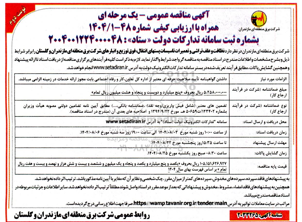 شرکت برق منطقه ای مازندران و گلستان در نظر دارد نظافت و علف تراشی و تعمیرات تاسیسات پستهای انتقال، فوق توزیع و انبارهای شرکت برق منطقه ای مازندران و گلستان را برابر شرایط ذیل و بشرح مشخصات و اطلاعات مندرج در اسناد مناقصه به مناقصه گر واجد شرایط واگذار نماید. لازم به ذکر است کلیه فرآیندهای برگزاری مناقصه از دریافت اسناد تا ارائه پیشنهاد و همچنین گشایش پاکات، مطابق فرآیند تعریف شده در بستر سامانه تدارکات الکترونیک دولت به آدرس سایت ستاد ایران انجام خواهد شد.