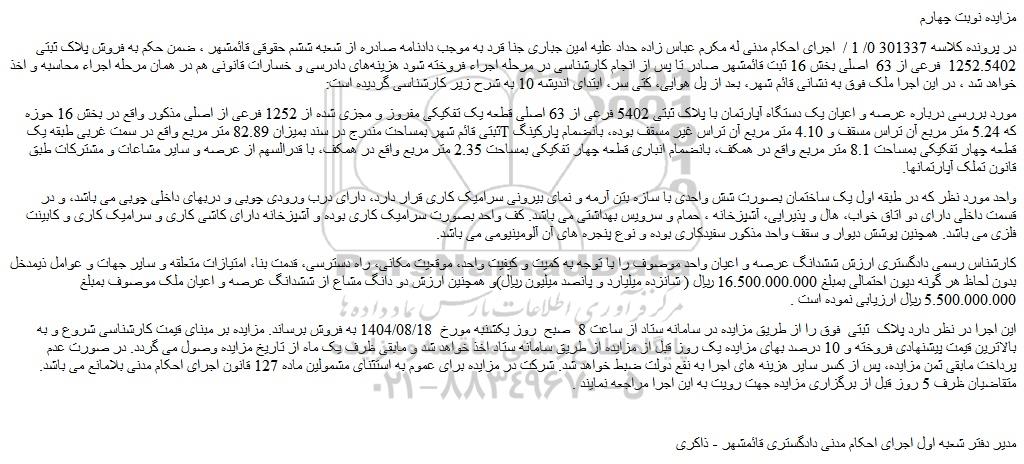 در پرونده کلاسه 301337 0/ 1 / اجرای احکام مدنی له مکرم عباس زاده حداد علیه امین جباری جنا قرد به موجب دادنامه صادره از شعبه ششم حقوقی قائمشهر ، ضمن حکم به فروش پلاک ثبتی 1252.5402 فرعی از 63 اصلی بخش 16 ثبت قائمشهر صادر تا پس از انجام کارشناسی در مرحله اجراء فروخته شود هزینه های دادرسی و خسارات قانونی هم در همان مرحله اجراء محاسبه و اخذ خواهد شد ، در این اجرا ملک فوق به نشانی قائم شهر، بعد از پل هوایی، کتی سر، ابتدای اندیشه 10 به شرح زیر کارشناسی گردیده است: