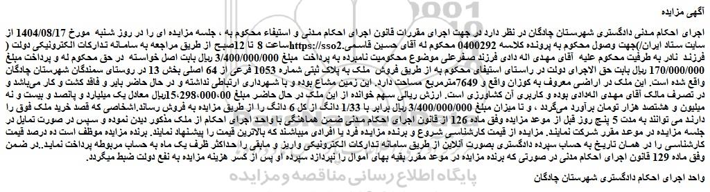 اجرای احکام مدنی دادگستری شهرستان چادگان در نظر دارد در جهت اجرای مقررات قانون اجرای احکام مدنی و استیفاء محکوم به ، جلسه مزایده ای را در روز شنبه مورخ 1404/08/17 از ساعت 8 تا 12صبح از طریق مراجعه به سامانه تدارکات الکترونیکی دولت (سایت ستاد ایران)جهت وصول محکوم به پرونده کلاسه 0400292 محکوم له آقای حسین قاسمی فرزند نادر به طرفیت محکوم علیه آقای مهدی اله دادی فرزند صفرعلی موضوع محکومیت نامبرده به پرداخت مبلغ 3/400/000/000 ریال بابت اصل خواسته در حق محکوم له و پرداخت مبلغ 170/000/000 ریال بابت حق الاجرای دولت در راستای استیفای محکوم به از طریق فروش ملک به پلاک ثبتی شماره 1053 فرعی از 64 اصلی بخش 13 در روستای سمندگان شهرستان چادگان واقع شده است. این ملک در اراضی معروف به کوزان واقع و 7649مترمربع مساحت دارد. این زمین مشاع بوده و با شهرداری ارتباطی نداشته و در حال حاضر بایر و فاقد کشت و کار می باشد و در تصرف مالک آقای مهدی اله دادی بوده و کاربری آن کشاورزی است. ارزش ریالی سهم خوانده از این ملک در حال حاضر مبلغ 15،298،000،00ریال معادل یک میلیارد و پانصد و بیست و نه میلیون و هشتصد هزار تومان برآورد می گردد ، و تا میزان مبلغ 3/400/000/000 ریال برابر با 1/33 دانگ از کل 6 دانگ را از طریق مزایده به فروش رساند.اشخاصی که قصد خرید ملک فوق را دارند می توانند به مدت 5 پنج روز قبل از موعد مزایده وفق ماده 126 از قانون اجرای احکام مدنی ضمن هماهنگی با واحد اجرای احکام از ملک مذکور دیدن نموده و سپس در صورت تمایل در جلسه مزایده در موعد مقرر شرکت نمایند. مزایده از قیمت کارشناسی شروع و برنده مزایده فرد یا افرادی میباشند که بالاترین قیمت را پیشنهاد نمایند. برنده مزایده موظف است ده درصد قیمت کارشناسی را در همان تاریخ به حساب سپرده دادگستری بصورت آنلاین از طریق سامانه تدارکات الکترونیکی واریز و مابقی را حداکثر ظرف یک ماه به حساب مربوطه پرداخت نماید..در ضمن وفق ماده 129 قانون اجرای احکام مدنی در صورتی که برنده مزایده در موعد مقرر بقیه بهای اموال را نپردازد سپرده او پس از کسر هزینه مزایده به نفع دولت ضبط میگردد.