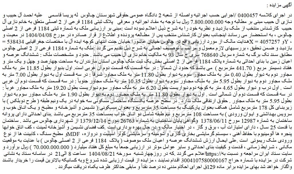در اجرای کلاسه 0400457 /اجرایی حسب اجرائیه واصله از شعبه 2 دادگاه عمومی حقوقی شهرستان چالوس له پریسا قاسمی علیه احمد آل حبیب و نازی آل حبیب مبنی بر مطالبه وجه 7.800.000.000 ریال با توجه به مفاد اجرائیه و معرفی پلاک ثبتی 1184 فرعی از 2 اصلی متعلق به خانم نازی آل حبیب کارشناس منتخب از ملک بازدید و نظریه خود را به شرح ذیل اعلام نموده است :مبنی بر ارزیابی ملک به شماره ثبتی 1184 فرعی از 2 اصلی چالوس ، به استحضار می رساند اینجانب بعنوان کارشناس منتخب پس از مطالعه پرونده و اطلاع از قرار صادره در مورخ 1404/04/08 در معیت و هدایت مالک از مورد ارزیابی واقع در چالوس خیابان عاشورا خیابان جنت انتهای کوچه ایده آل با مختصات جغرافیایی 538434 =x و 4057257 =y ، بازدید و ضمن تحقیق ، بررسیهای لازم معمول و مراتب با توصیف اجمالی به شرح ذیل تقدیم می گردد :ملک به شماره 1184 فرعی از 2 اصلی چالوس مطابق سند تک برگ به شماره سریال 768640 سری ج سال 93 به مالکیت خانم نازی آل حبیب می باشد . حدود و مشخصات ملک : ششدانگ عرصه و اعیان زمین با بنای احداثی به شماره پلاک 1184 فرعی از 2 اصلی بخش یک ثبت ملک چالوس استان مازندران به مساحت چهارصد و چهل و یک متر و هفتاد دسیمتر مربع ( 441.70 مترمربع ) می باشد که حدود آن شمالاً : در سه قسمت که قسمت دوم آن غربی است. اول بدیوار بطول 11.85 متر به ملک مجاور دوم به دیوار بطول 0.40 متر به ملک مجاور سوم به دیوار بطول 11.80 متر به ملک مجاور شرقاً : در سه قسمت اول به دیوار بطول 7.00 متر به ملک مجاور دوم به دیوار بطول 5.95 متر به ملک مجاور سوم به دیوار بطول 10.35 متر به ملک مجاور جنوباً : در سه قسمت که قسمت دوم آن غربی است . اول درب و دیوار بطول 4.65 متر به کوچه دوم دیواریست بطول 6.20 متر به ملک مجاور سوم دیواریست بطول 19.20 متر به ملک مجاور غرباً : در سه قسمت که قسمت دوم آن شمالی است . اول به دیوار بطول 11.80 متر به ملک مجاور دوم به دیوار بطول 1.90 متر به ملک مجاور سوم به دیوار بطول 5.95 متر به ملک مجاور . حقوق ارتفاقی ملک ندارد . در سطح عرصه یکدستگاه ساختمان مسکونی سه خوابه در یک ونیم طبقه ( طرح دوبلکس ) با زیربنای کل 178 مترمربع شامل همکف بعنوان پارکینگ به مساحت 35 مترمربع و بعنوان مسکونی ( نشیمن و آشپزخانه و مطبخ و یک اتاق خوب و سرویس بهداشتی و ایوان ورودی ) به مساحت 108 مترمربع و نیم طبقه شامل دو اتاق خواب بمساحت 35 مترمربع می باشد .بنای احداثی دارای پروانه ساختمان به شماره 12987 مورخ 1378/06/11 وگواهی پایان ساختمان به شماره 26763 مورخ 1379/12/14 از شهرداری چالوس می باشد . ساختمان با قدمت 25 سال ، دارای امتیازات آب ، برق و گاز ، در اختیار مالک و در حال بهره برداری است .کف فضای نشیمن و آشپزخانه لمینت ، کف اتاق خوابها و مطبخ سنگ ، کابینت ها از نوع mdf ، پنجره ها آلومینیوم با حفاظ آهنی ، سیستم گرمایشی بخاری گازی و شومینه و سرمایشی کولر اسپلیت و دروازه ورودی ملک ریموتی است .علی ایحال ارزش ششدانگ عرصه و اعیان ملک موصوف ( پلاک 1184 فرعی از 2 اصلی چالوس ) با عنایت به موقعیت مکانی ، شرایط زمانی ، قدمت و کیفیت بنای احداثی و سایر عوامل موثر در ارزیابی جمعاً به مبلغ کل هفتاد میلیارد ( 70.000.000.000 ) ریال برآورد و اعلام می گردد .که در روزچهارشنبه مورخه 1404/08/21 ساعت 8 الی21 در سامانه ستاد به نشانی سایت ستاد ایران مراجعه و نسبت به شرکت در مزایده با شماره حراج 3004107580000167 اقدام نمایند ، مزایده از قیمت ارزیابی شده شروع وبه کسانیکه بالاترین قیمت را خریدار باشند واگذار خواهد شد بهای مزایده برابر ماده 129ق اجرای احکام مدنی ده درصد نقداً و مابقی حداکثر ظرف یکماه دریافت میگردد .