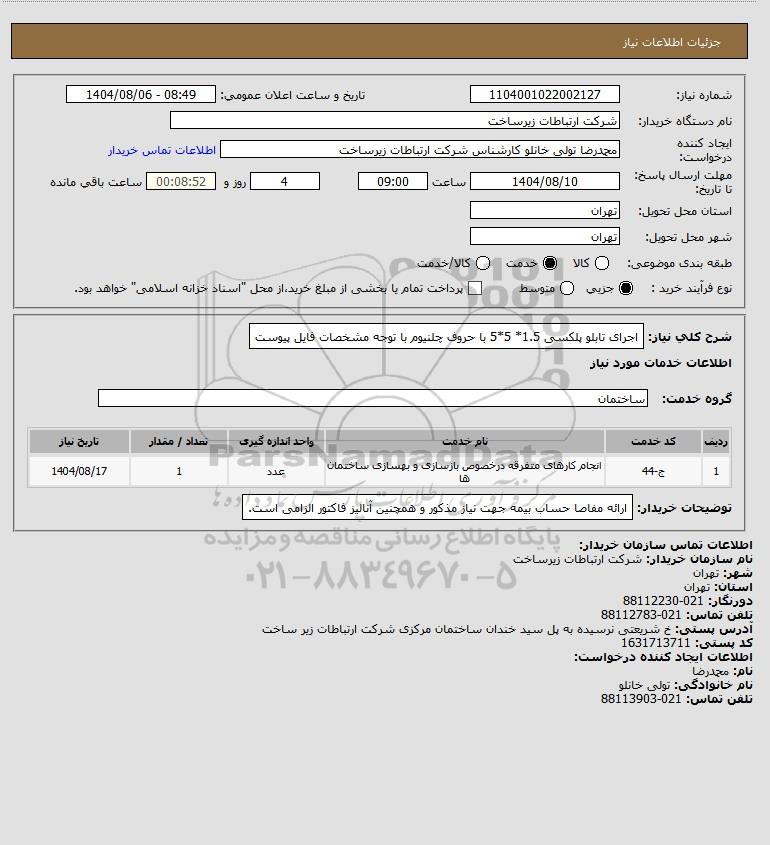 شرح کلی نیاز: اجرای تابلو پلکسی 1.5* 5*5 با حروف چلنیوم با توجه مشخصات فایل پیوست