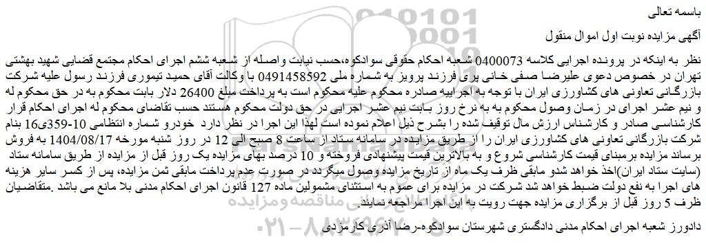 نظر به اینکه در پرونده اجرایی کلاسه 0400073 شعبه احکام حقوقی سوادکوه،حسب نیابت واصله از شعبه ششم اجرای احکام مجتمع قضایی شهید بهشتی تهران در خصوص دعوی علیرضا صفی خانی پری فرزند پرویز به شماره ملی 0491458592 با وکالت آقای حمید تیموری فرزند رسول علیه شرکت بازرگانی تعاونی های کشاورزی ایران با توجه به اجراییه صادره محکوم علیه محکوم است به پرداخت مبلغ 26400 دلار بابت محکوم به در حق محکوم له و نیم عشر اجرای در زمان وصول محکوم به به نرخ روز بابت نیم عشر اجرایی در حق دولت محکوم هستند حسب تقاضای محکوم له اجرای احکام قرار کارشناسی صادر و کارشناس ارزش مال توقیف شده را بشرح ذیل اعلام نموده است لهذا این اجرا در نظر دارد  خودرو شماره انتظامی 10-359ی16 بنام شرکت بازرگانی تعاونی های کشاورزی ایران را از طریق مزایده در سامانه ستاد از ساعت 8 صبح الی 12 در روز شنبه مورخه 1404/08/17 به فروش برساند مزایده برمبنای قیمت کارشناسی شروع و به بالاترین قیمت پیشنهادی فروخته و 10 درصد بهای مزایده یک روز قبل از مزایده از طریق سامانه ستاد  (سایت ستاد ایران)اخذ خواهد شدو مابقی ظرف یک ماه از تاریخ مزایده وصول میگردد در صورت عدم پرداخت مابقی ثمن مزایده، پس از کسر سایر هزینه های اجرا به نفع دولت ضبط خواهد شد شرکت در مزایده برای عموم به استثنای مشمولین ماده 127 قانون اجرای احکام مدنی بلا مانع می باشد .متقاضیان ظرف 5 روز قبل از برگزاری مزایده جهت رویت به این اجرا مراجعه نمایند.