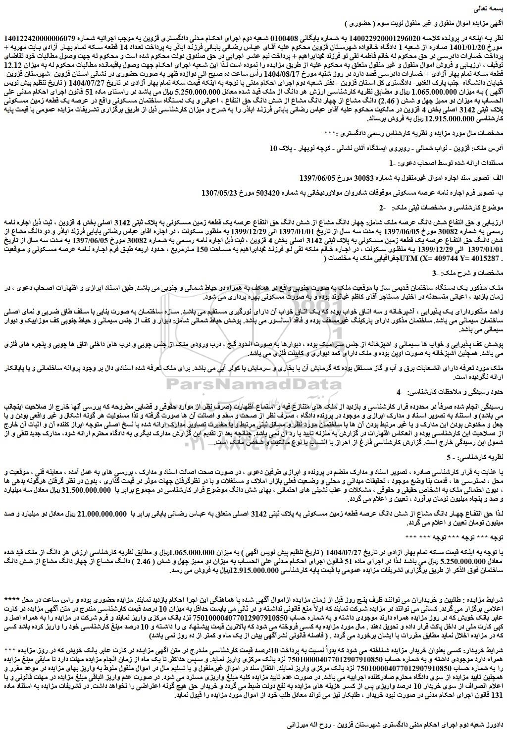 نظر به اینکه در پرونده کلاسه 140022920001296020 به شماره بایگانی 0100408 شعبه دوم اجرای احکام مدنی دادگستری قزوین به موجب اجرائیه شماره 140122420000006079 مورخ 1401/01/20 صادره از شعبه 1 دادگاه خانواده شهرستان قزوین محکوم علیه آقای عباس رضائی بابائی فرزند اباذر به پرداخت تعداد 14 قطعه سکه تمام بهار آزادی بابت مهریه + پرداخت خسارات دادرسی در حق محکوم له خانم فاطمه تقی لو فرزند محمدابراهیم + پرداخت نیم عشر اجرایی در حق صندوق دولت محکوم شده است و محکوم له جهت وصول مطالبات خود تقاضای توقیف ، ارزیابی و فروش اموال منقول و غیر منقول متعلق به محکوم علیه از طریق مزایده را نموده است لذا این شعبه اجرای احکام جهت وصول باقیمانده مطالبات محکوم له به میزان 12.12 قطعه سکه تمام بهار آزادی + خسارات دادرسی قصد دارد در روز شنبه مورخ 1404/08/17 رأس ساعت ده صبح الی دوازده ظهر به صورت حضوری در نشانی استان قزوین -شهرستان قزوین- خیابان دانشگاه- جنب پارک الغدیر- دادگستری کل استان قزوین - دفتر شعبه دوم اجرای احکام مدنی با توجه به اینکه قیمت سکه تمام بهار آزادی در تاریخ 1404/07/27 ( تاریخ تنظیم پیش نویس آگهی ) به میزان 1.065.000.000 ریال و مطابق نظریه کارشناسی ارزش هر دانگ از ملک قید شده معادل 5.250.000.000 ریال می باشد در راستای ماده 51 قانون اجرای احکام مدنی علی الحساب به میزان دو ممیز چهل و شش ( 2.46) دانگ مشاع از چهار دانگ مشاع از شش دانگ حق انتفاع ، اعیانی و یک دستگاه ساختمان مسکونی واقع در عرصه یک قطعه زمین مسکونی پلاک ثبتی 3142 اصلی بخش 4 قزوین در مالکیت محکوم علیه آقای عباس رضائی بابائی فرزند اباذر را به شرح و میزان کارشناسی ذیل از طریق برگزاری تشریفات مزایده عمومی با قیمت پایه کارشناسی 12.915.000.000 ریال به فروش برساند.