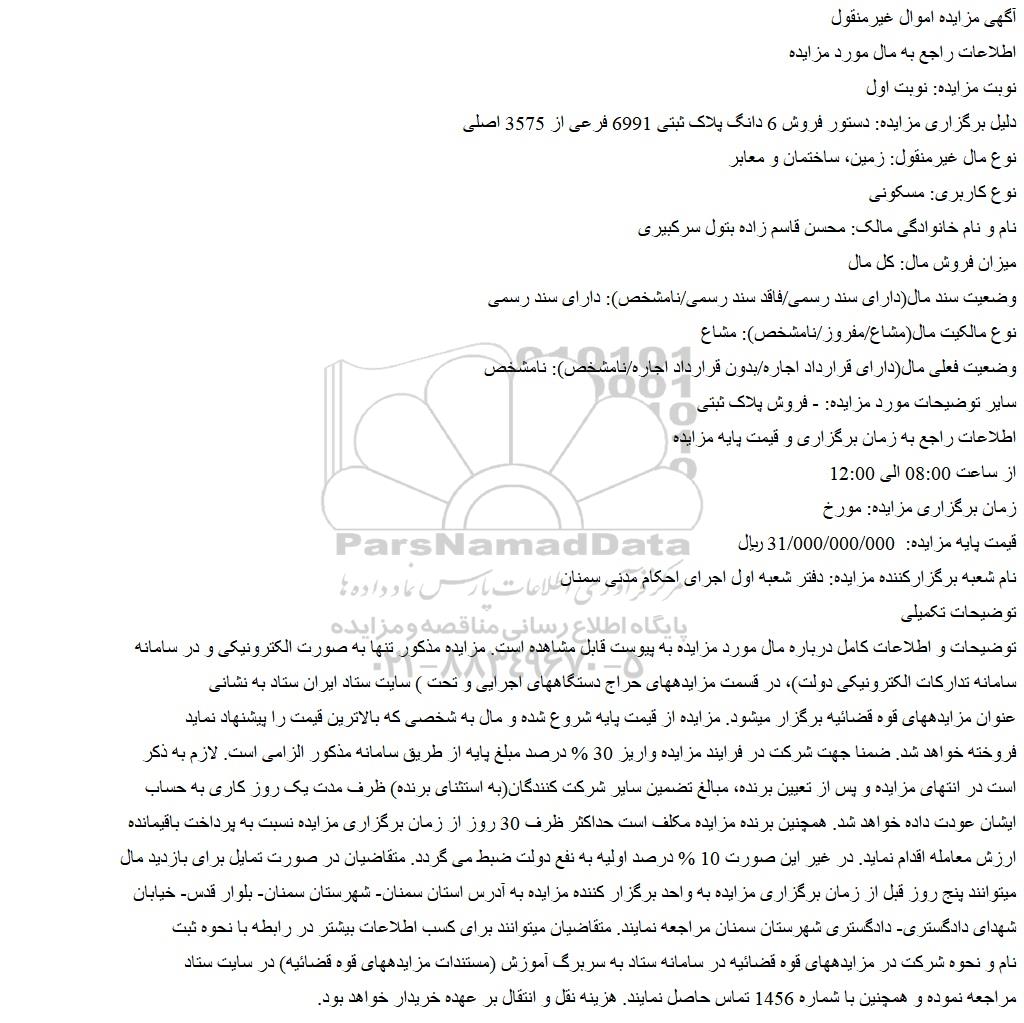 نام شعبه برگزارکننده مزایده: دفتر شعبه اول اجرای احکام مدنی سمنان