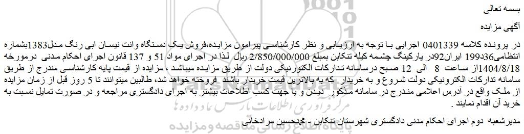 در پرونده کلاسه 0401339 اجرایی با توجه به ارزیابی و نظر کارشناسی پیرامون مزایده،فروش یک دستگاه وانت نیسان ابی رنگ مدل1383بشماره انتظامی36د199 ایران92در پارکینگ چشمه کیله تنکابن بمبلغ 2/850/000/000 ریال لذا در اجرای مواد 51 و 137 قانون اجرای احکام مدنی درمورخه 1404/8/18از ساعت 8 الی 12 صبح درسامانه تدارکات الکتورنیکی دولت از طریق مزایده میباشد ، مزایده از قیمت پایه کارشناسی مندرج از طریق سامانه تدارکات الکترونیکی دولت شروع و به خریدار که به بالاترین قیمت خریدار باشند فروخته خواهد شد، طالبین میتوانند تا 5 روز قبل از زمان مزایده از ملک واقع در آدرس اعلامی مندرج در سامانه مذکور دیدن و یا جهت کسب اطلاعات بیشتر به اجرای دادگستری مراجعه و در صورت تمایل نسبت به خرید آن اقدام نمایند .
