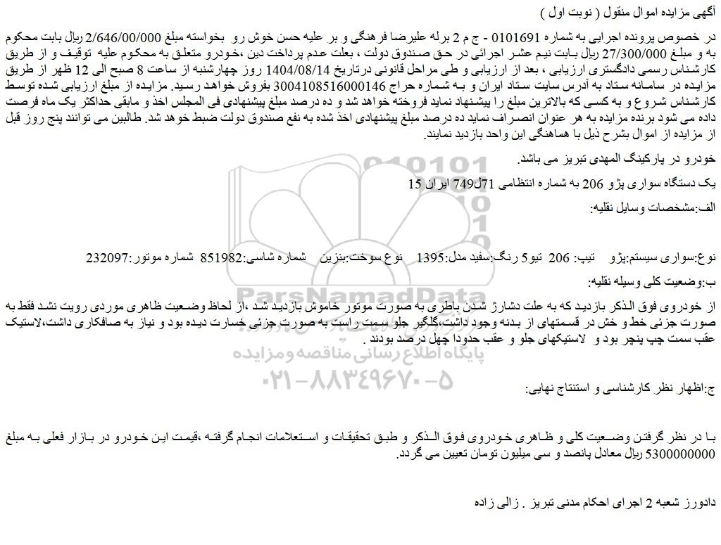 در خصوص پرونده اجرایی به شماره 0101691 - ج م 2 برله علیرضا فرهنگی و بر علیه حسن خوش رو بخواسته مبلغ 2/646/00/000 ریال بابت محکوم به و مبلغ 27/300/000 ریال بابت نیم عشر اجرائی در حق صندوق دولت ، بعلت عدم پرداخت دین ،خودرو متعلق به محکوم علیه توقیف و از طریق کارشناس رسمی دادگستری ارزیابی ، بعد از ارزیابی و طی مراحل قانونی درتاریخ 1404/08/14 روز چهارشنبه از ساعت 8 صبح الی 12 ظهر از طریق مزایده در سامانه ستاد به آدرس سایت ستاد ایران و به شماره حراج 3004108516000146 بفروش خواهد رسید. مزایده از مبلغ ارزیابی شده توسط کارشناس شروع و به کسی که بالاترین مبلغ را پیشنهاد نماید فروخته خواهد شد و ده درصد مبلغ پیشنهادی فی المجلس اخذ و مابقی حداکثر یک ماه فرصت داده می شود برنده مزایده به هر عنوان انصراف نماید ده درصد مبلغ پیشنهادی اخذ شده به نفع صندوق دولت ضبط خوهد شد. طالبین می توانند پنج روز قبل از مزایده از اموال بشرح ذیل با هماهنگی این واحد بازدید نمایند.