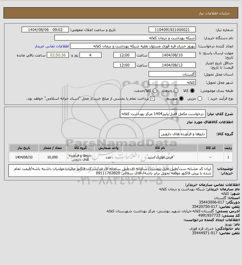 شرح کلی نیاز: درخواست مکمل فصل پاییز1404 مرکز بهداشت کلاله