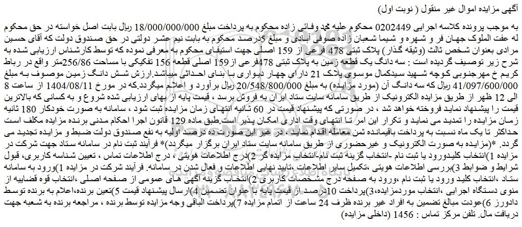 به موجب پرونده کلاسه اجرایی 0202449 محکوم علیه محمد وفائی زاده محکوم به پرداخت مبلغ 18/000/000/000 ریال بابت اصل خواسته در حق محکوم له عفت الملوک جهان فر و شهره و شیما شعبان زاده صوفی آبادی و مبلغ 5درصد محکوم به بابت نیم عشر دولتی در حق صندوق دولت که آقای حسین مرادی بعنوان شخص ثالث (وثیقه گذار) پلاک ثبتی 478 فرعی از 159 اصلی جهت استیفای محکوم به معرفی نموده که توسط کارشناس ارزیابی شده به شرح زیر توصیف گردیده است : سه دانگ یک قطعه زمین به پلاک ثبتی 478فرعی از159 اصلی قطعه 156 تفکیکی با مساحت 256/86متر واقع در رباط کریم خ مهرجنوبی کوچه شهید سیدکمال موسوی پلاک 21 دارای چهار دیواری با بنای احداثی میباشد.ارزش شش دانگ زمین موصوف به مبلغ 41/097/600/000 ریال که سه دانگ آن (مورد مزایده) به مبلغ 20/548/800/000 ریال برآورد و اعلام میگردد.که در مورخ 1404/08/11 از ساعت 8 الی 12 ظهر از طریق مزایده الکترونیک از طریق سامانه سایت ستاد ایران به فروش برسد ، قیمت پایه از بهای ارزیابی شده شروع و به کسانی که بالاترین قیمت را پیشنهاد نماید فروخته خواهد شد ، در صورتی که پیشنهاد قیمت در 60 ثانیه انتهای زمان مزایده ثبت شود ، سامانه به صورت خودکار 180 ثانیه زمان مزایده را تمدید می نماید و تکرار این امر تا انتهای وقت اداری امکان پذیر است.طبق ماده 129 قانون اجرا احکام مدنی برنده مزایده مکلف است حداکثر تا یک ماه نسبت به پرداخت باقیمانده ثمن معامله اقدام نماید ، در غیر این صورت ده درصد اولیه به نفع صندوق دولت ضبط و مزایده تجدید می گردد. *(مزایده به صورت الکترونیک و غیرحضوری از طریق سامانه سایت ستاد ایران برگزار میگردد)* فرآیند ثبت نام در سامانه ستاد جهت شرکت در مزایده 1)انتخاب کلیدورود یا ثبت نام -انتخاب گزینه ثبت نام-انتخاب مزایده گر 2)درج اطلاعات هویتی ، درج اطلاعات تماس ، تعیین شناسه کاربری، قبول شرایط و ضوابط 3)بررسی اطلاعات هویتی ،تکمیل سایر اطلاعات ،تایید نهایی اطلاعات و فعال شدن در سامانه. فرآیند شرکت در مزایده 1)ورود به سامانه ستاد ،انتخاب کلید ورود یا ثبت نام ،ورود به صفحه درج مشخصات کاربری 2)انتخاب گزینه آگهی های عمومی از صفحه اصلی ،انتخاب قوه قضاییه از منوی دستگاه اجرایی ،انتخاب موردمزایده،3)پرداخت 10درصد از قیمت پایه با عنوان تضمین 4)ارسال پیشنهاد قیمت 5)تعین برنده،اعلام به برنده توسط دادورز 6)عودت مبالغ تضمین به افراد غیر برنده ظرف 24 ساعت از اتمام مزایده 7)پرداخت الباقی وجه مزایده توسط برنده ، مراجعه برنده به شعبه جهت دریافت مال. تلفن مرکز تماس : 1456 (داخلی مزایده)