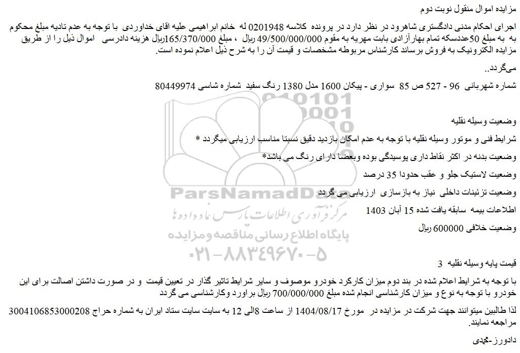 مزایده عمومی مزایده خودرو سواری - پیکان 1600 مدل 1380 رنگ سفید برگزار میگردد. از کلیه افراد متخصص و شرکتهای واجد شرایط دعوت به عمل میآید تا در این مزایده با کد خبرگزاری پارس نماد : 9763426 شرکت نمایند تاریخ شروع مزایده : 1404/07/27 مهلت شرکت در مزایده: تا پایان روز 1404/08/17 مکان برگزاری اموال واگذاری استانهای سمنان و دستهبندیهای مربوط به این حراجی انواع خودرو سبک میباشد.