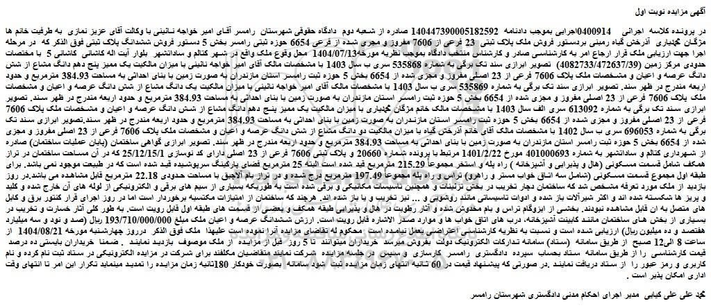 در پرونده کلاسه  اجرائی    0400914اجرایی بموجب دادنامه  140447390005182592 صادره از شعبه دوم  دادگاه حقوقی شهرستان  رامسر آقای امیر خواجه نائینی با وکالت آقای عزیز نمازی  به طرفیت خانم ها مژگان محمدیاری  آذرخش گیاه رمبنی بردستور فروش ملک پلاک ثبتی  23 فرعی از 7606 مفروز و مجری شده از فرعی 6654 حوزه ثبتی رامسر بخش 5 دستور فروش ششدانگ پلاک ثبتی فوق الذکر که  در مرحله اجرا جهت ارزیابی ملک قرار ارجاع امر به کارشناسی صادر و کارشناس منتخب دادگاه بموجب نظریه مورخه1404/07/13  محل وقوع ملک واقع در شهر کتالم و ساداتشهر  بلوار آیت اله کاشانی  کاشانی 5  با مختصات حدودی مرکز زمین (4082733/472637/39)  تصویر ابرازی سند تک برگی به شماره 535868 سری ب سال 1403 با مشخصات مالک آقای امیر خواجه نائینی با میزان مالکیت یک ممیز پنج دهم دانگ مشاع از شش دانگ عرصه و اعیان و مشخصات ملک پلاک 7606 فرعی از 23 اصلی مفروز و مجزی شده از 6654 بخش 5 حوزه ثبت رامسر استان مازندران به صورت زمین با بنای احداثی به مساحت 384.93 مترمربع و حدود اربعه مندرج در ظهر سند. تصویر ابرازی سند تک برگی به شماره 535869 سری ب سال 1403 با مشخصات مالک آقای امیر خواجه نائینی با میزان مالکیت یک دانگ مشاع از شش دانگ عرصه و اعیان و مشخصات ملک پلاک 7606 فرعی از 23 اصلی مفروز و مجزی شده از 6654 بخش 5 حوزه ثبت رامسر استان مازندران به صورت زمین با بنای احداثی به مساحت 384.93 مترمربع و حدود اربعه مندرج در ظهر سند. تصویر ابرازی سند تک برگی به شماره 613092 سری الف سال 1403 با مشخصات مالک خانم مژگان محمدیاری با میزان مالکیت یک ممیز پنج دهم دانگ مشاع از شش دانگ عرصه و اعیان و مشخصات ملک پلاک 7606 فرعی از 23 اصلی مفروز و مجزی شده از 6654 بخش 5 حوزه ثبت رامسر استان مازندران به صورت زمین با بنای احداثی به مساحت 384.93 مترمربع و حدود اربعه مندرج در ظهر سند.تصویر ابرازی سند تک برگی به شماره 696053 سری ب سال 1402 با مشخصات مالک آقای خانم آذرخش گیاه با میزان مالکیت دو دانگ مشاع از شش دانگ عرصه و اعیان و مشخصات ملک پلاک 7606 فرعی از 23 اصلی مفروز و مجزی شده از 6654 بخش 5 حوزه ثبت رامسر استان مازندران به صورت زمین با بنای احداثی به مساحت 384.93 مترمربع و حدود اربعه مندرج در ظهر سند. تصویر ابرازی گواهی ساختمان (پایان عملیات ساختمان) صادره از شهرداری کتالم و ساداتشهر به شماره 401000693 مورخ 1401/2/22 مرتبط با پرونده شماره 20660 و پلاک ثبتی 7606 فرعی از 23 اصلی دارای کد نوسازی 25/12/15/1 که در آن مساحت ساختمان در تراز همکف شامل قسمت مسکونی (هال و پذیرایی و آشپزخانه ) راه پله و استخر مجموعاً 215.29 مترمربع قید شده است البته 25 مترمربع فضای پارکینگ سرپوشیده قید شده است که در طبیعت موجود نمی باشد. برای طبقه اول مجموع قسمت مسکونی (شامل سه اتاق خواب مستر و راهرو) تراس و راه پله مجموعاً 197.49 مترمربع درج شده و در تراز بام آلاچیق با مساحت حدودی 22.18 مترمربع قابل مشاهده می باشد.در روز بازدید از ملک مورد تعرفه مشخص شد که ساختمان دچار تخریب در بخش تزئینات و همچنین تاسیسات مکانیکی و برقی شده است به طوریکه بسیاری از سیم های برقی و الکترونیکی از لوله های آن خارج شده و کلید و پریز ها شکسته شده اند و اکثر شیرآلات باز شده و ادوات تاسیساتی مانند روشویی و ... نیز تخریب و یا باز شده اند. هرچند که ساختمان از امتیازات مکتسبه برخوردار است اما در روز اجرای قرار کنتور برق و کابل های متصل به ان قابل مشاهده نبودند. بخشی از ایزوگام تراس و بام مخدوش شده و آثار رطوبت در هال و پذیرایی طبقه همکف و بعضی از قسمت های طبقه اول قابل رویت است. به طور کلی آثار خسارت و تخریب در بسیاری از بخش های ساختمان مانند کابینت آشپزخانه، درب های اتاق خواب ها و موارد صدر الاشاره قابل رویت است. ارزش ششدانگ عرصه و اعیان ملک مبلغ 193/710/000/000 ریال (صد و نود و سه میلیارد هفتصد و ده میلیون ریال ) ارزیابی شده است و نسبت به نظریه کارشناسی اعتراضی بعمل نیامده است  محکوم له تقاضای مزایده آنرا نموده است علیهذا  ملک فوق الذکر  درروز چهارشنبه مورخه 1404/08/21 