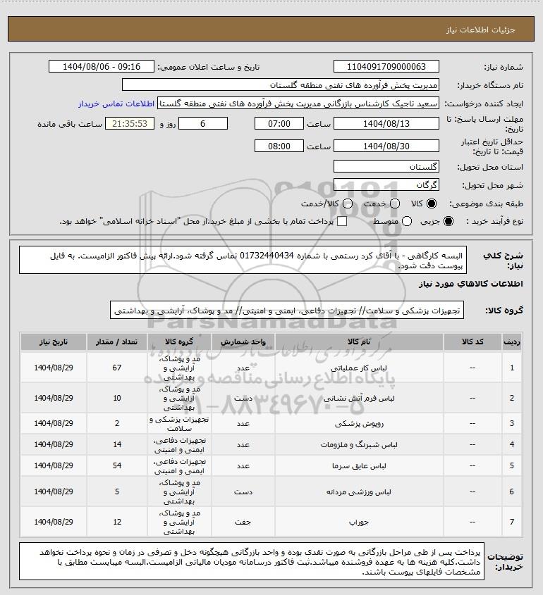 شرح کلی نیاز: البسه کارگاهی - با آقای کرد رستمی با شماره 01732440434 تماس گرفته شود.ارائه پیش فاکتور الزامیست. به فایل پیوست دقت شود.