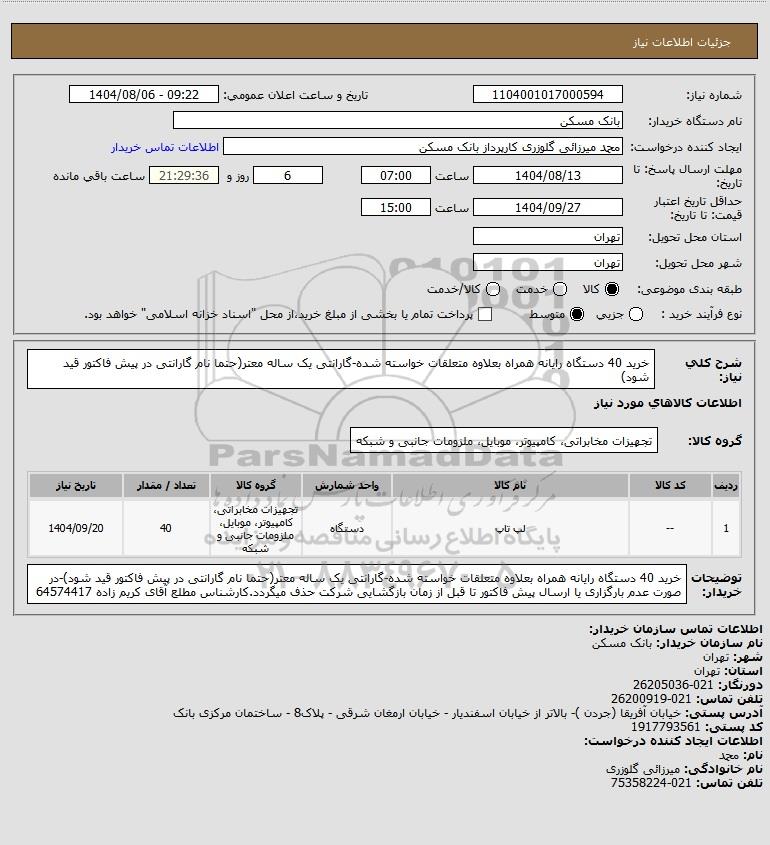 شرح کلی نیاز: خرید 40 دستگاه رایانه همراه بعلاوه متعلقات خواسته شده-گارانتی یک ساله معتر(حتما نام گارانتی در پیش فاکتور قید شود)