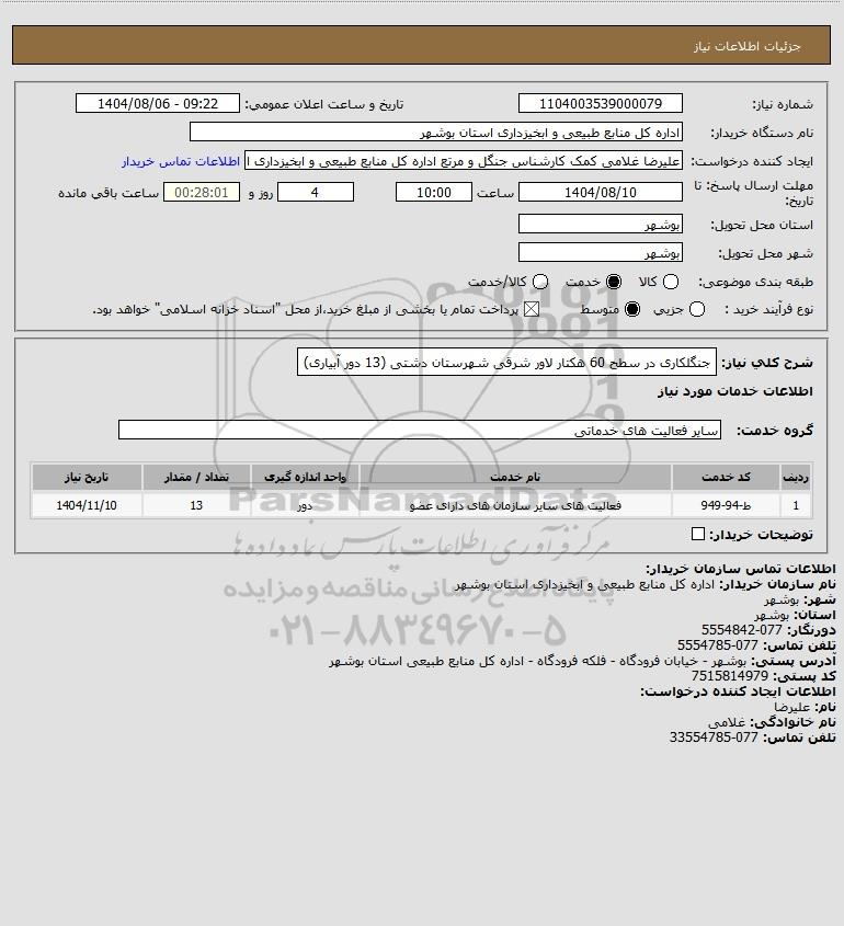 شرح کلی نیاز: جنگلکاری در سطح 60 هکتار لاور شرقی شهرستان دشتی (13 دور آبیاری)