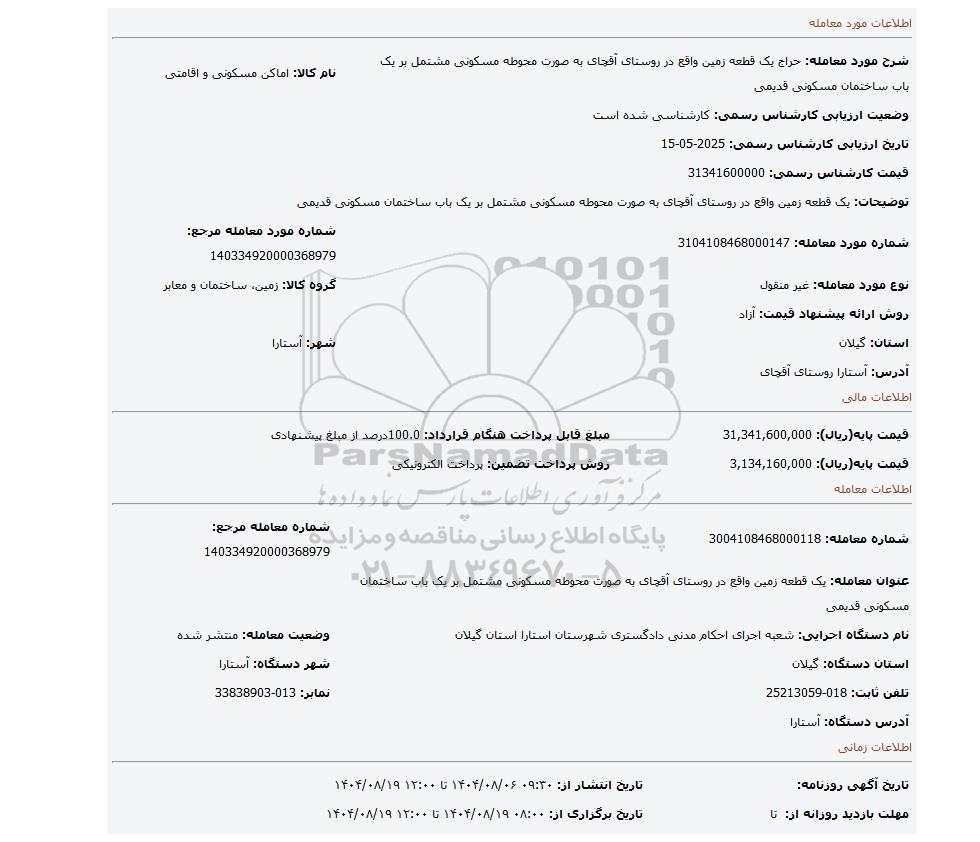 شرح مورد معامله: حراج یک قطعه زمین واقع در روستای آقچای به صورت محوطه مسکونی مشتمل بر یک باب ساختمان مسکونی قدیمینام کالا: اماکن مسکونی و اقامتی