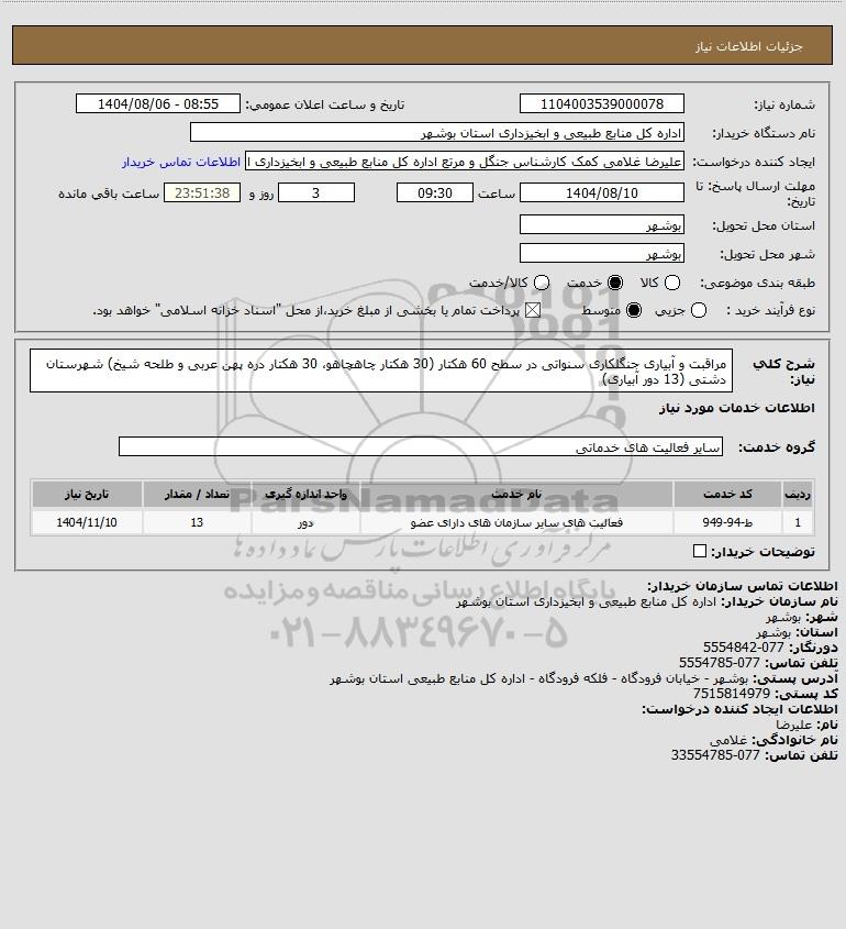 شرح کلی نیاز: مراقبت و آبیاری جنگلکاری سنواتی در سطح 60 هکتار (30 هکتار چاهچاهو، 30 هکتار دره پهن عربی و طلحه شیخ) شهرستان دشتی (13 دور آبیاری)