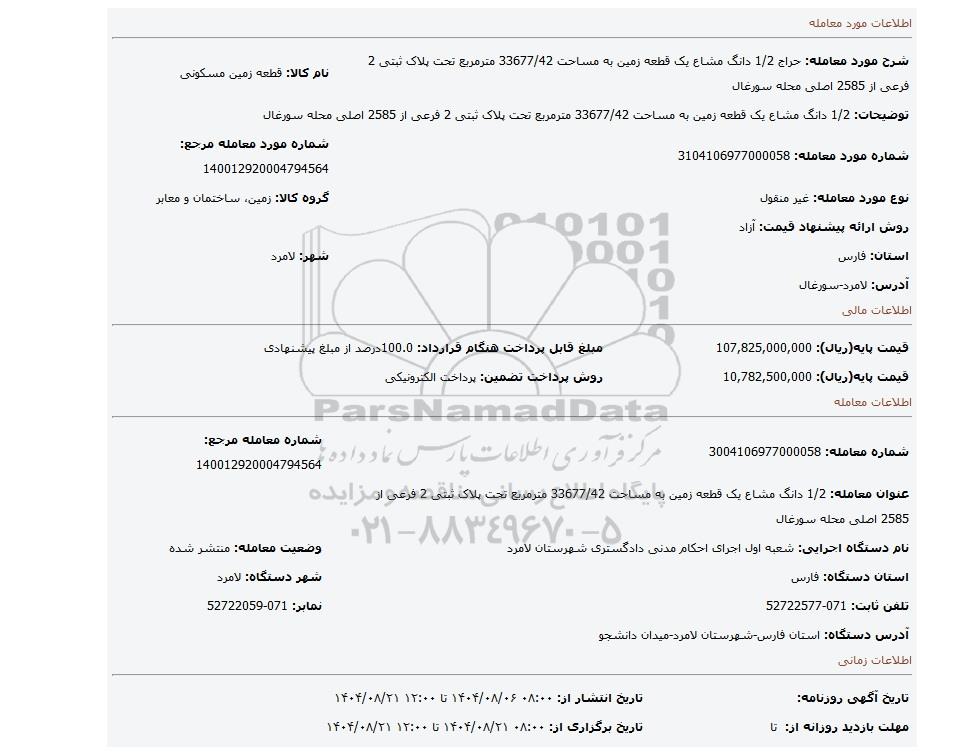 | شرح مورد معامله: حراج 1/2 دانگ مشاع یک قطعه زمین به مساحت 33677/42 مترمربع تحت پلاک ثبتی 2 فرعی از 2585 اصلی محله سورغال | نام کالا: قطعه زمین مسکونی | |