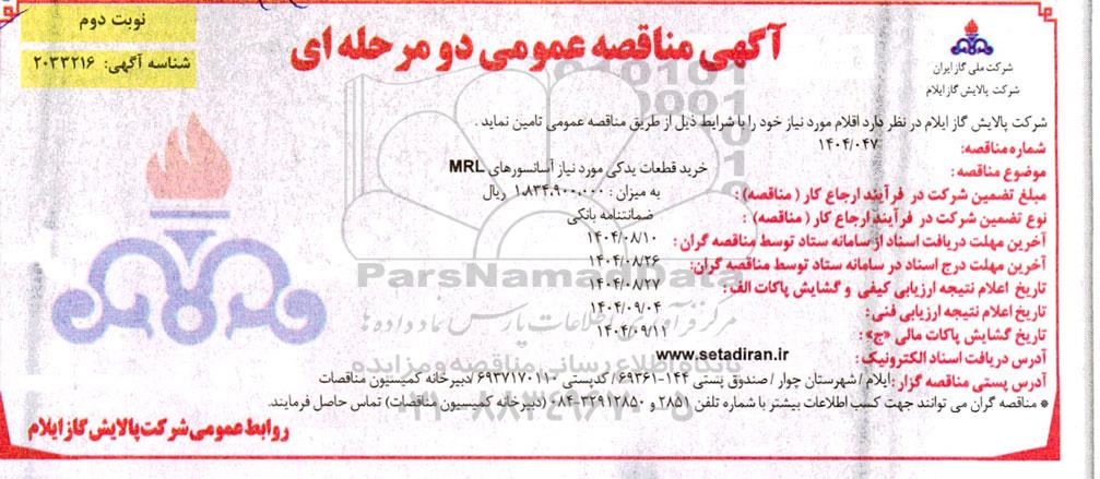 شرکت پالایش گاز ایلام در نظر دارد اقلام مورد نیاز خود را با شرایط ذیل از طریق مناقصه عمومی تامین نماید