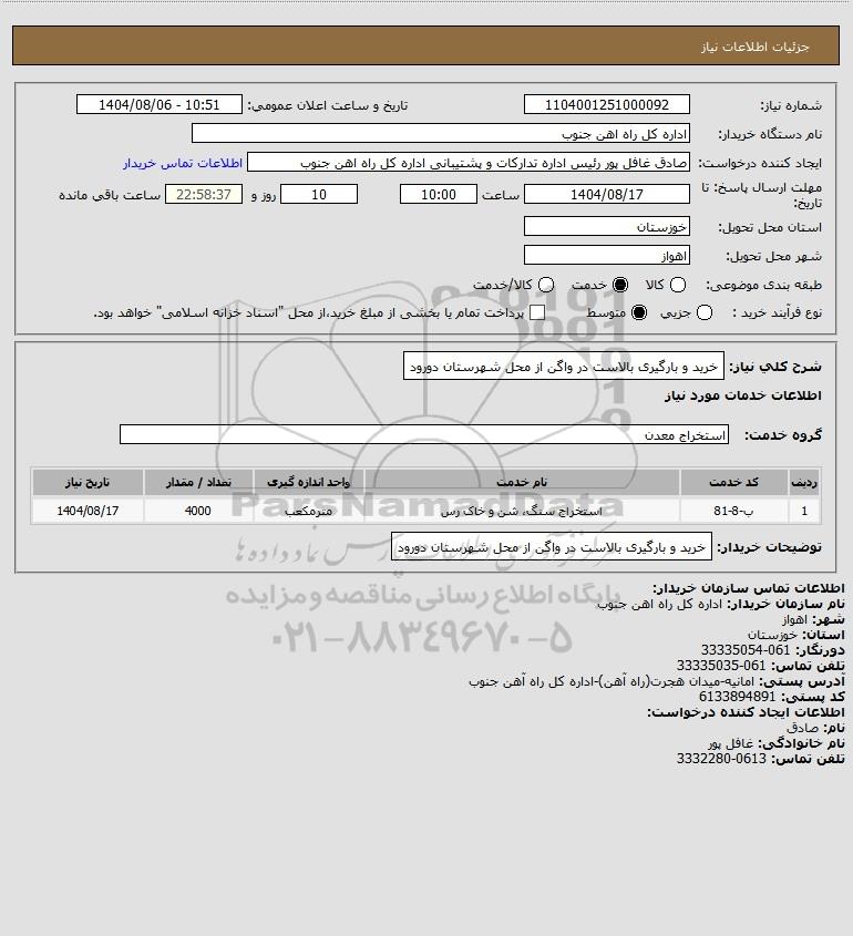 شرح کلی نیاز: خرید و بارگیری بالاست در واگن از محل شهرستان دورود
