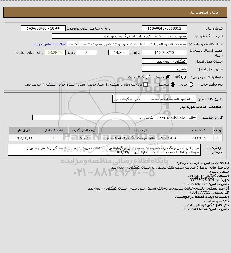 توضیحات خریدار:نجام امور تعمیر و نگهداری تاسیسات سرمایشی و گرمایشی ساختمان مدیریت شعب بانک مسکن و شعب یاسوج و مهمانسراهای تابعه به مدت یکسال از تاریخ 1404/09/01