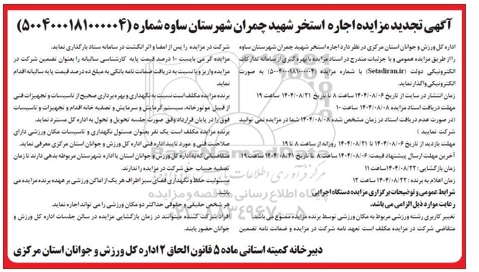 اداره کل ورزش و جوانان استان مرکزی در نظر دارد اجاره استخر شهید چمران شهرستان ساوه را از طریق مزایده عمومی و با جزئیات مندرج در اسناد مزایده با بهره گیری از سامانه تدارکات الکترونیکی دولت (ستاد ایران) با شماره مزایده (5004000181000004) به صورت الکترونیکی واگذار نماید.