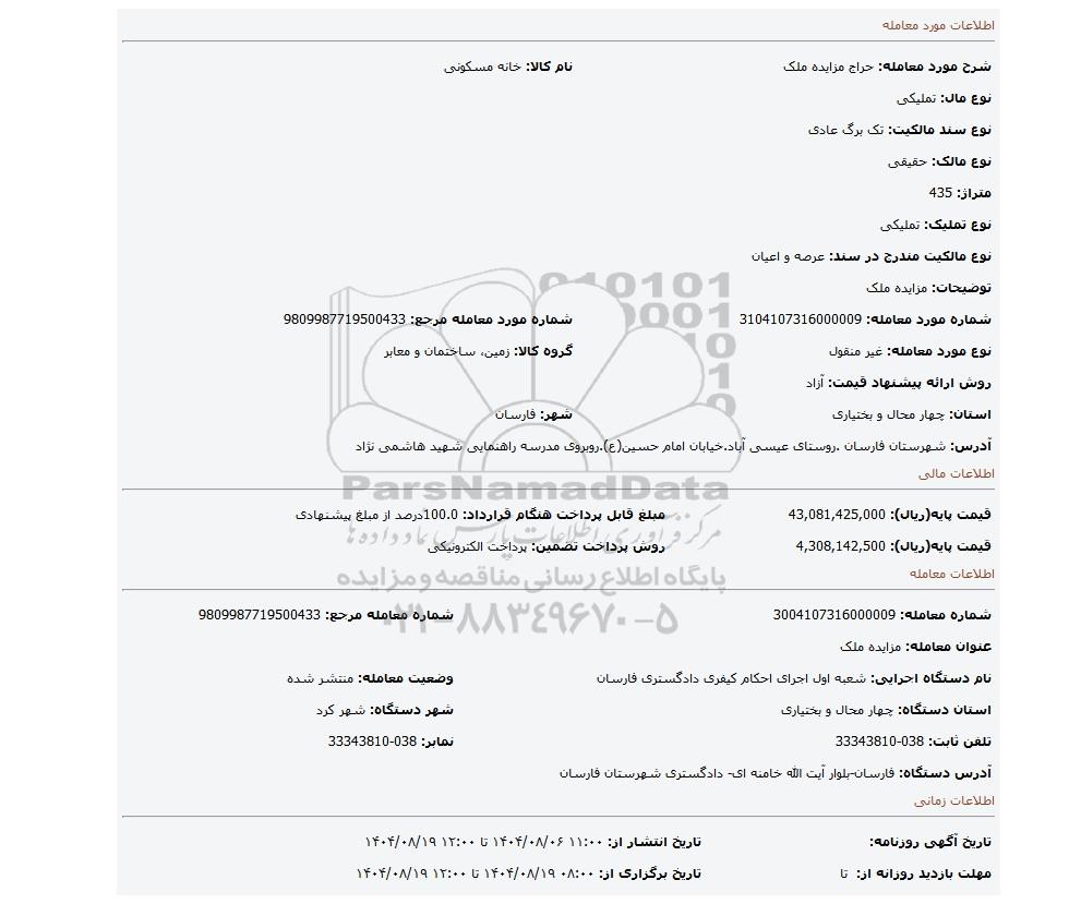 شماره مورد معامله: 3104107316000009شماره مورد معامله مرجع: 9809987719500433
