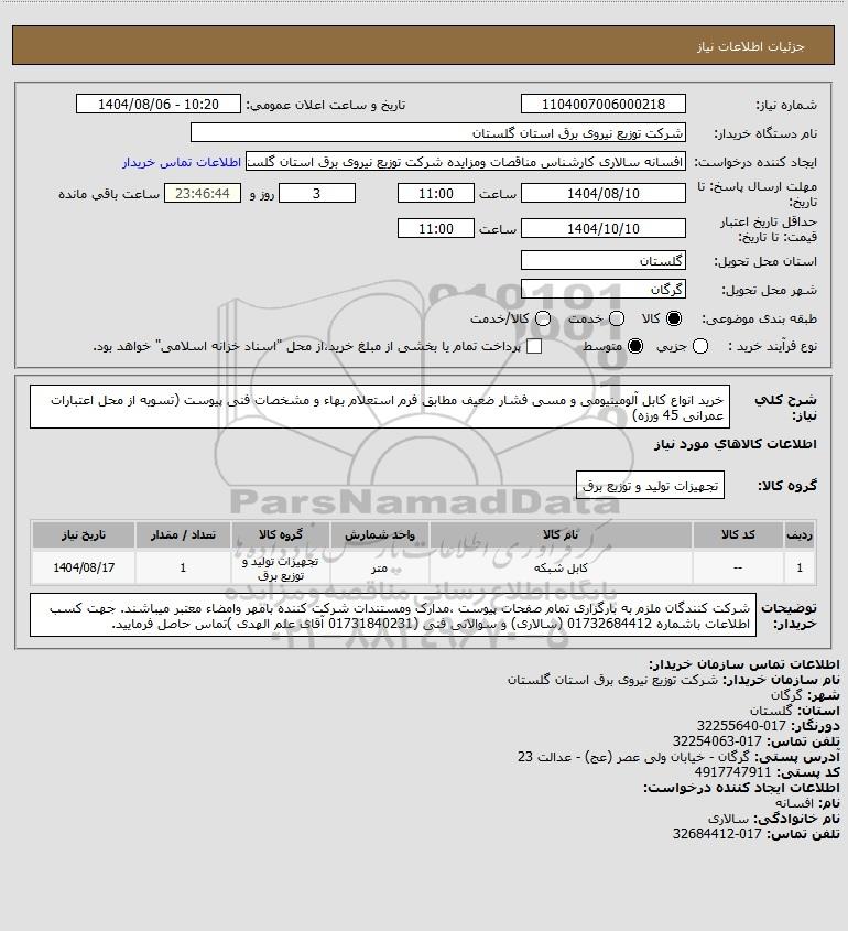 شرح کلی نیاز: خرید انواع کابل آلومینیومی و مسی فشار ضعیف مطابق فرم استعلام بهاء و مشخصات فنی پیوست (تسویه از محل اعتبارات عمرانی 45 ورزه)