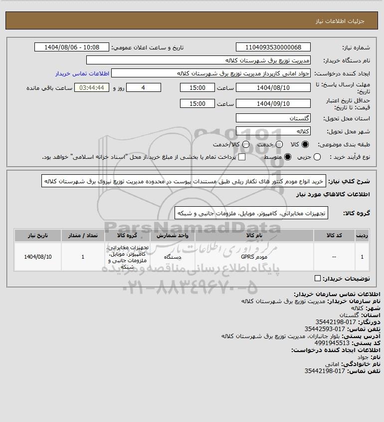 شرح کلی نیاز: خرید انواع مودم کنتور های تکفاز ریلی طبق مستندات پیوست در محدوده مدیریت توزیع نیروی برق شهرستان کلاله